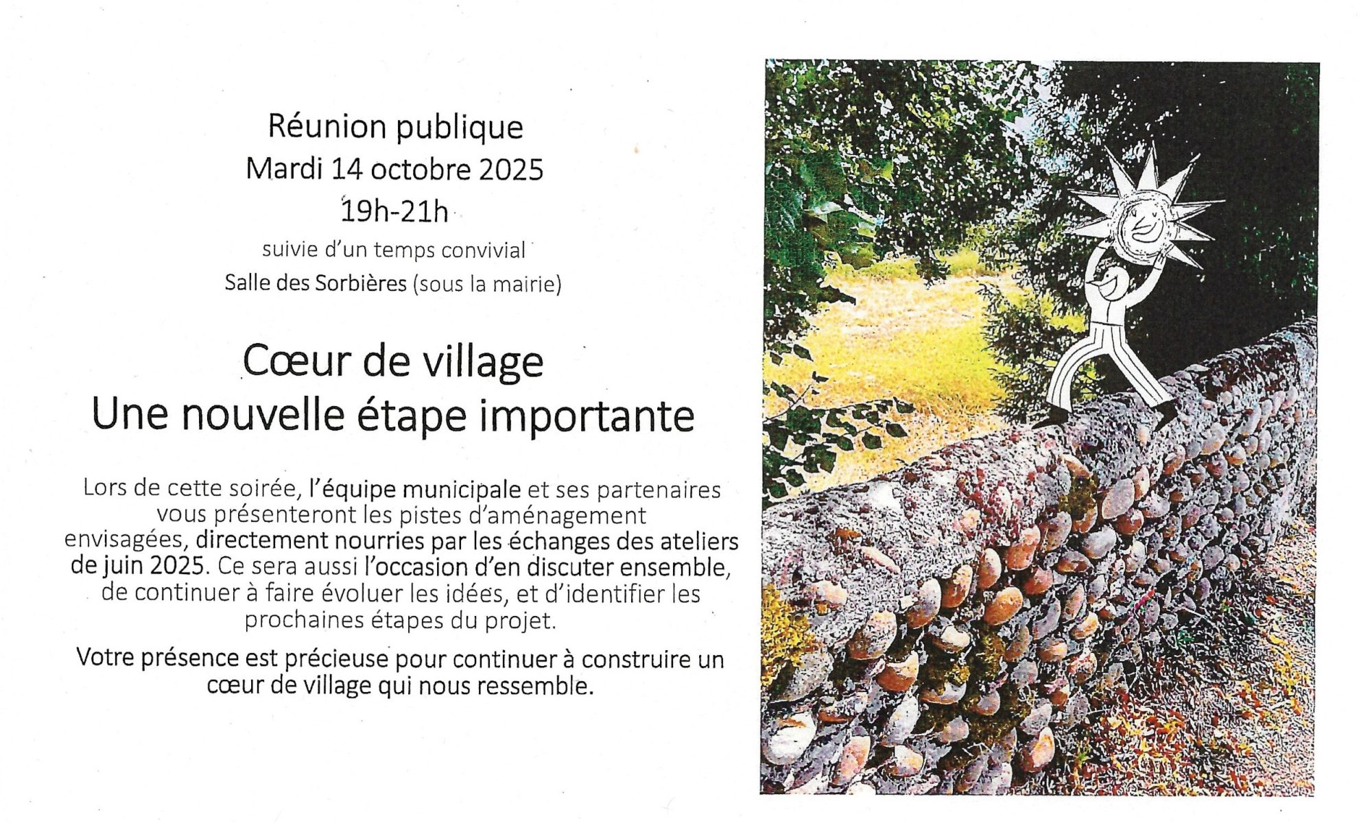 Lors de cette soirée, l’équipe municipale et ses partenaires vous présenteront les pistes d’aménagement envisagées, directement nourries par les échanges des ateliers de juin 2025. Ce sera aussi l’occasion d’en discuter ensemble, de continuer à faire évoluer les idées, et d’identifier les prochaines étapes du projet.